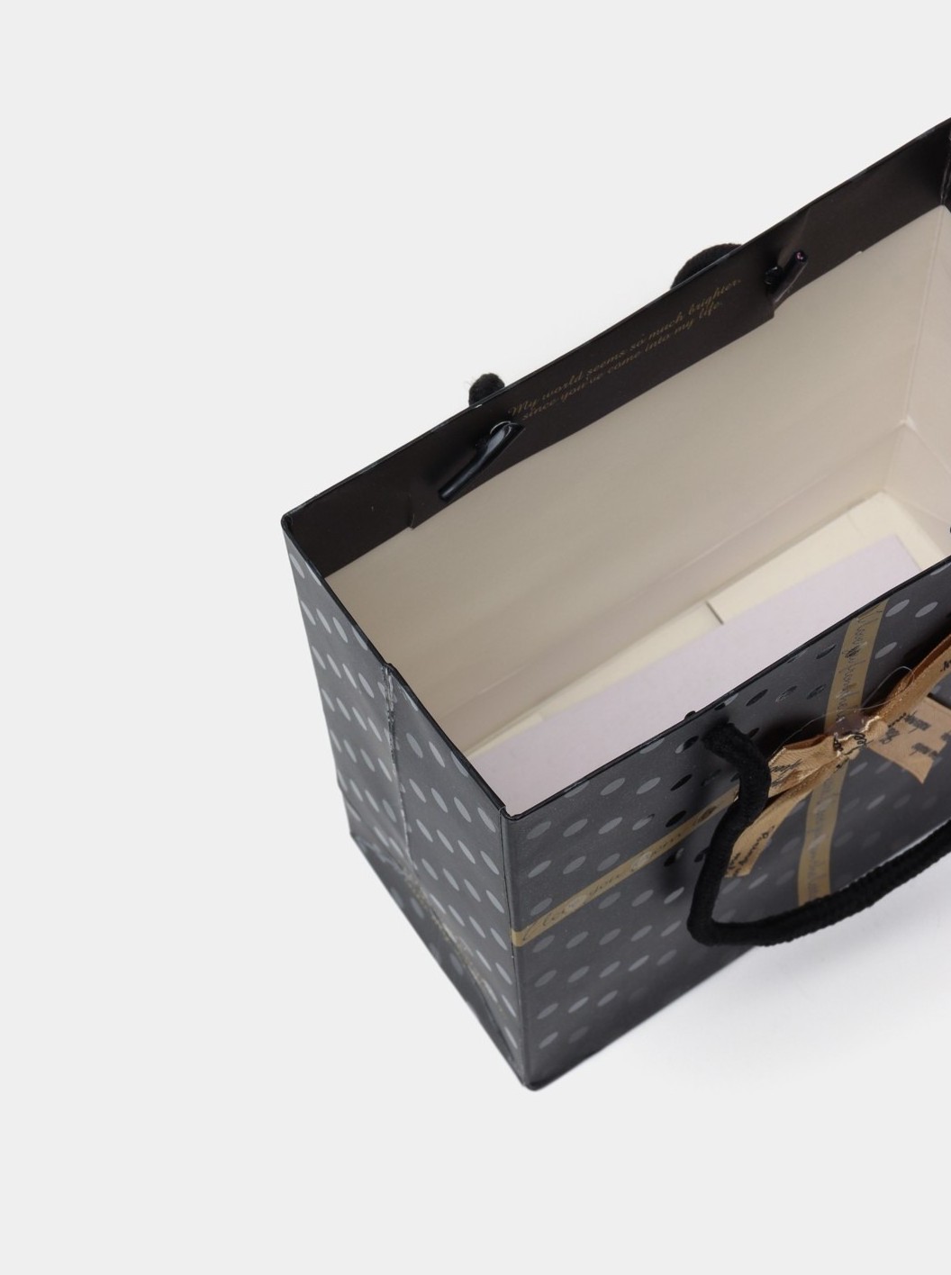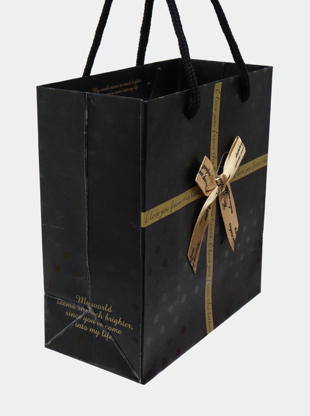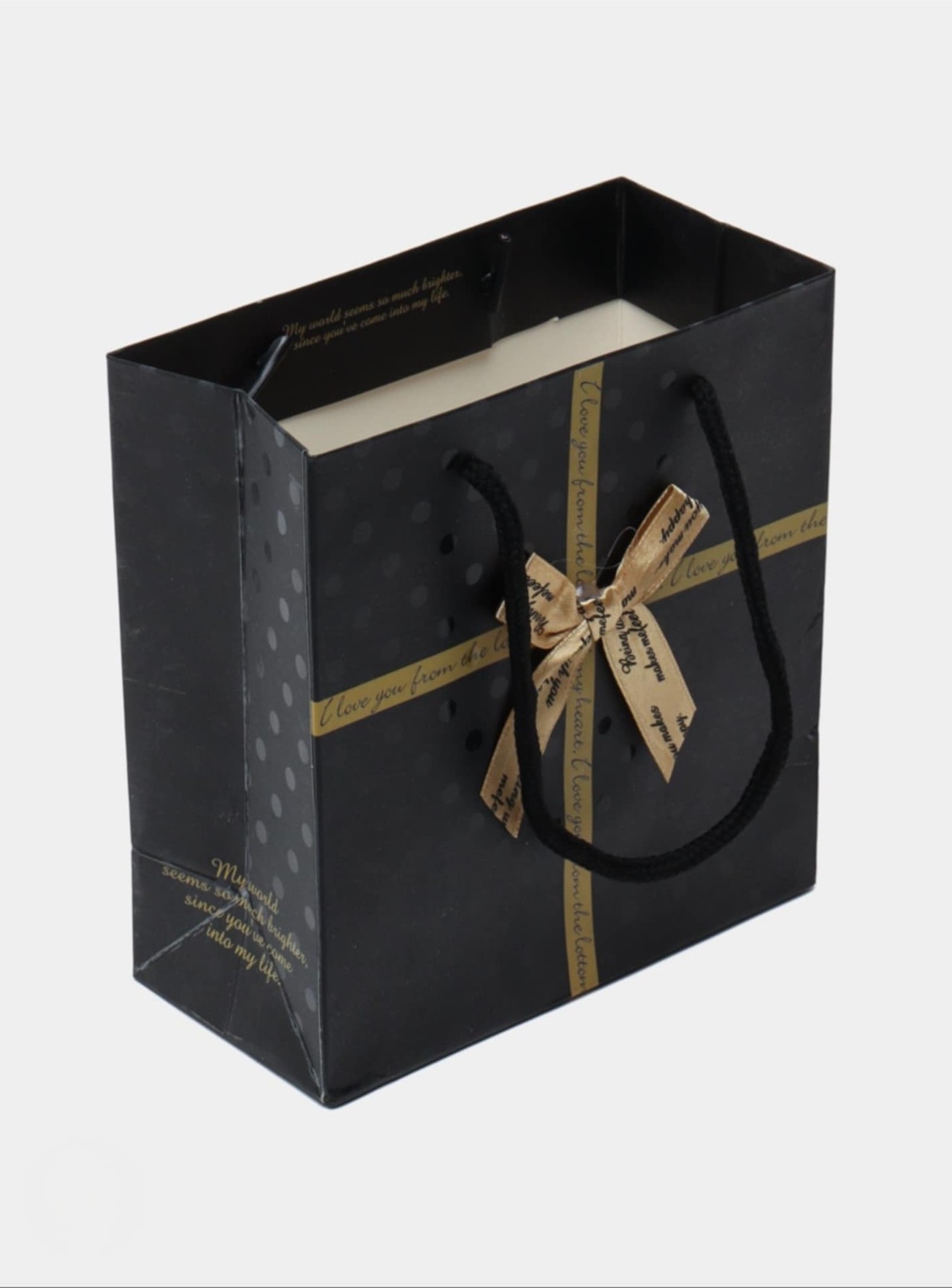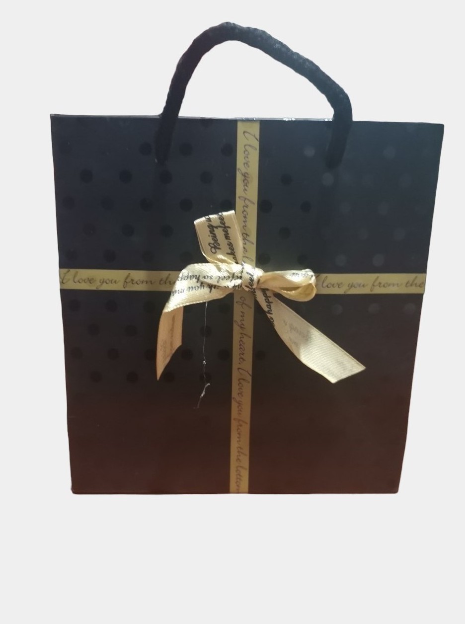Αναβαθμίστε την παρουσίαση του δώρου σας με αυτή την κομψή και ιδιαίτερη χάρτινη σακούλα! Με μαύρο φόντο και πουά λεπτομέρειες, στολισμένη με φιόγκο και φράση αγάπης, είναι ιδανική για ρομαντικά ή ξεχωριστά δώρα. Το μαλακό κορδόνι χειρολαβής προσφέρει άνετη μεταφορά και σταθερότητα. Ιδανική για γενέθλια, επετείους, εορταστικά δώρα ή ακόμα και επαγγελματικές περιστάσεις.