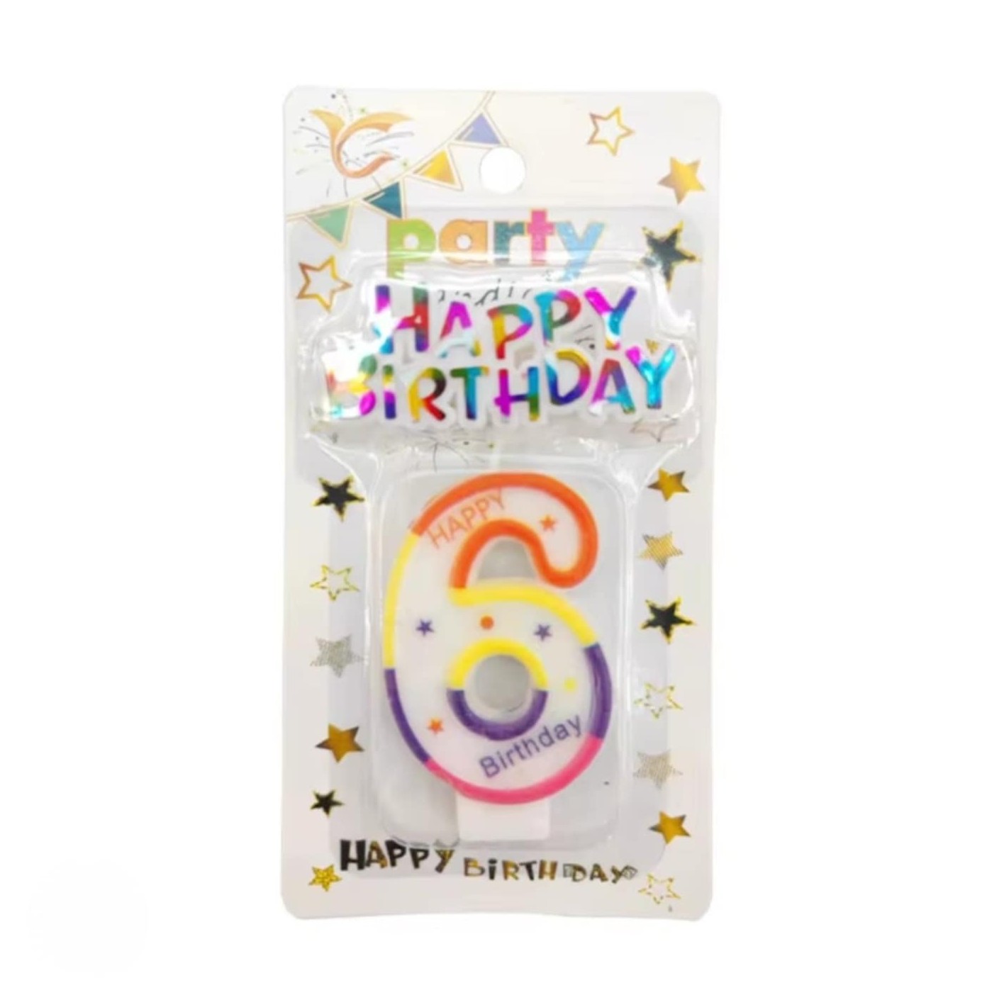 Κερί τούρτας γενεθλίων σε αριθμό 6, με πολύχρωμο σχέδιο και glitter λεπτομέρειες.