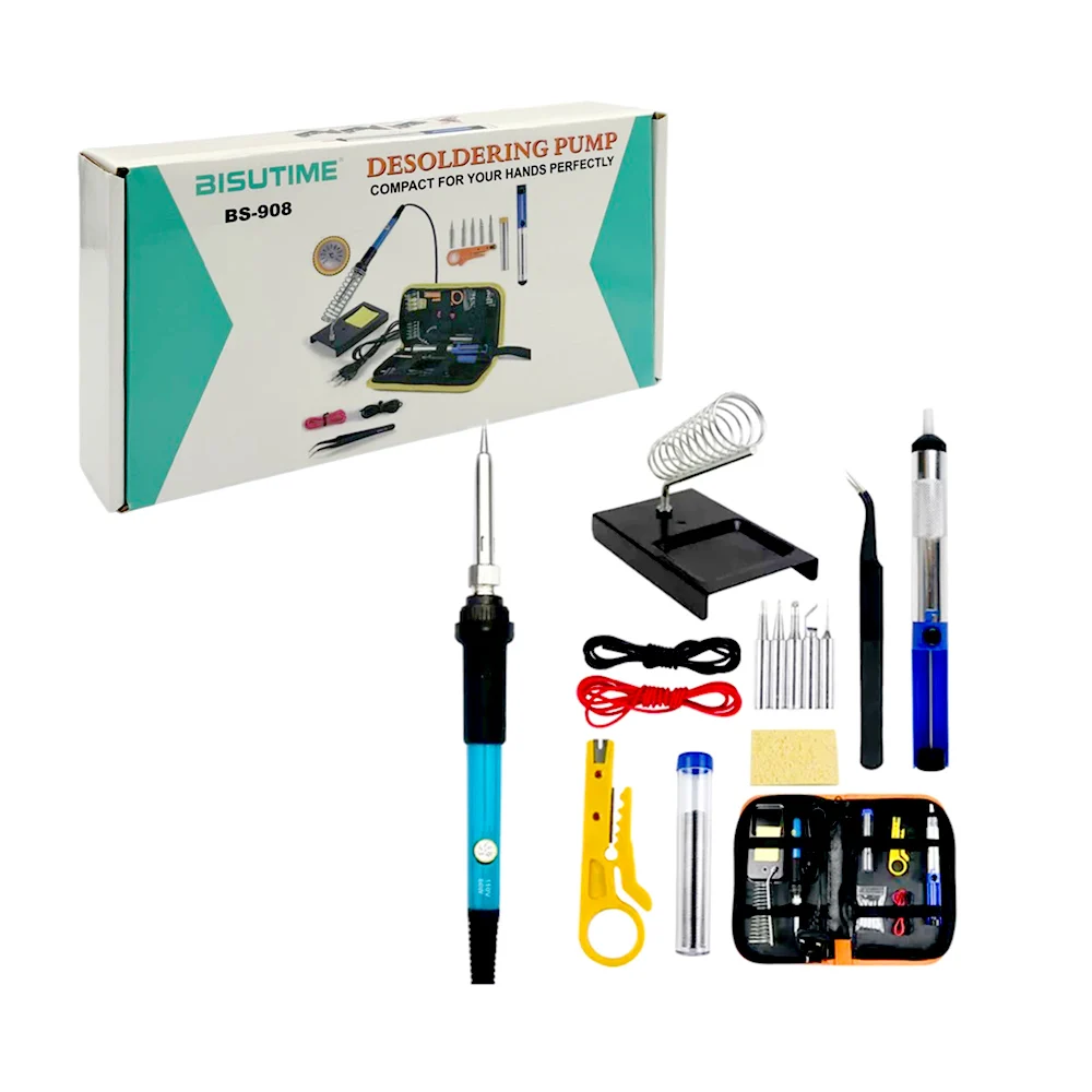 - Συμπεριλαμβανόμενα αξεσουάρ: 1 αντλία αποκόλλησης για εύκολη αφαίρεση κολλήσεων. 5 εναλλάξιμες άκρες για διαφορετικούς τύπους εργασιών. 1 βάση κολλητηρίου με σφουγγάρι καθαρισμού. 1 ρολό σύρματος κόλλησης (μικρή ποσότητα). 1 τσιμπιδάκι ανθεκτικό στη θερμότητα για τη συγκράτηση εξαρτημάτων. Θήκη μεταφοράς.
