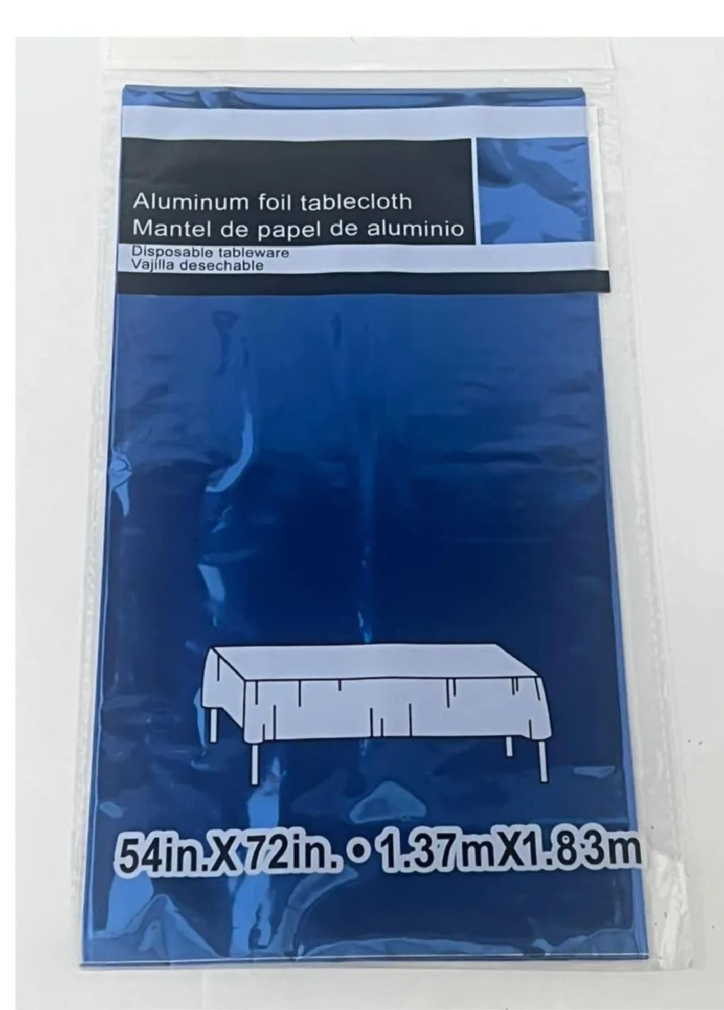 Τραπεζομάντηλα μίας χρήσης σε μπλε foil χρώμα, διαστάσεων 1,37 x 1,83 m, ιδανική για πάρτι και εκδηλώσεις.
