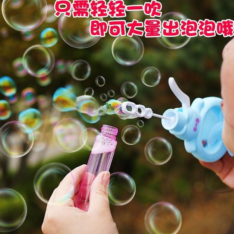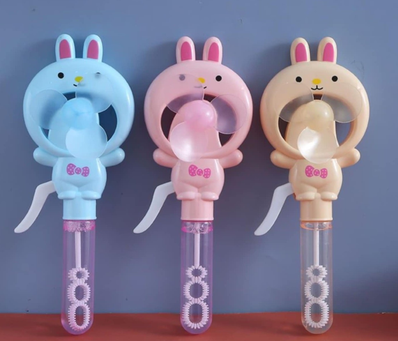 Παιχνίδι σαπουνόφουσκες με ενσωματωμένο ανεμιστήρα χειρός, σε σχέδιο κουνελάκι και 3 χρώματα.