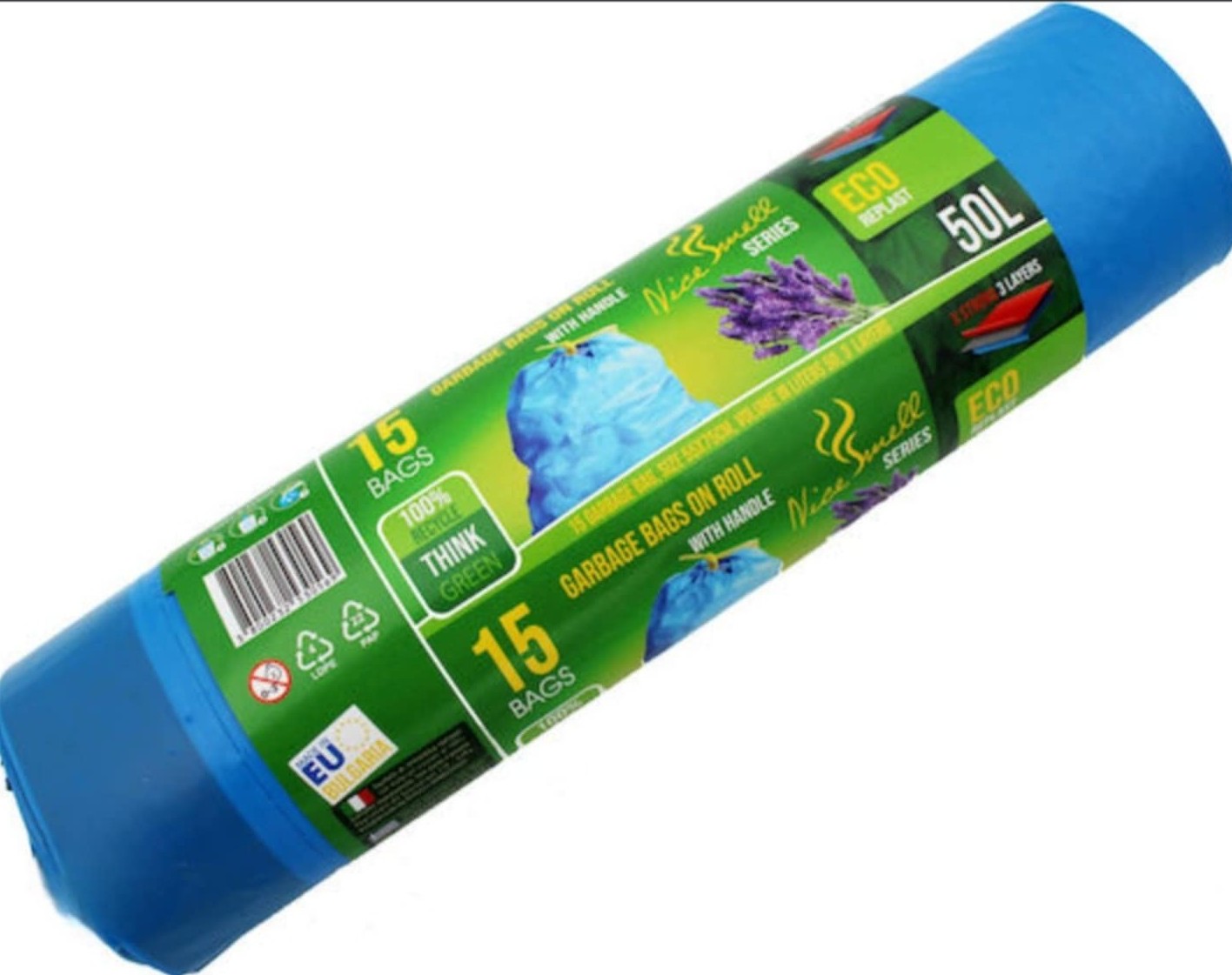 Σακούλες απορριμμάτων 50L με χερούλια και άρωμα λεβάντας. Σε ρολό 15 τεμαχίων, ενισχυμένες 3 στρώσεων, από 100% ανακυκλωμένο υλικό.