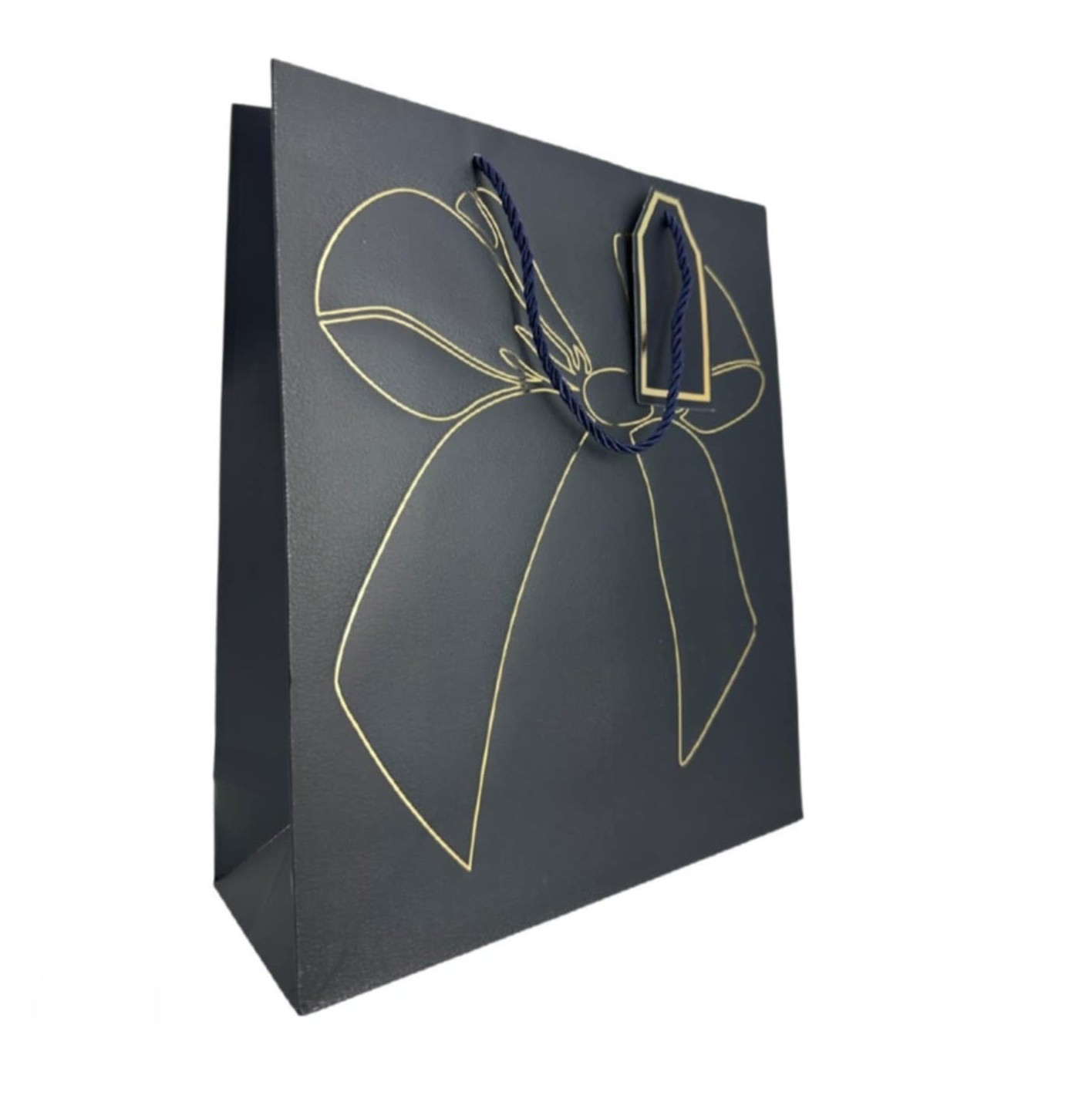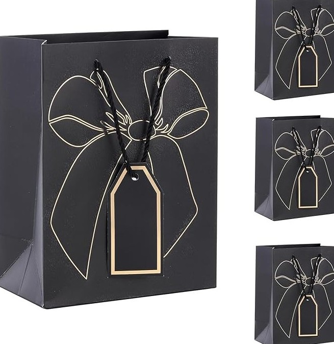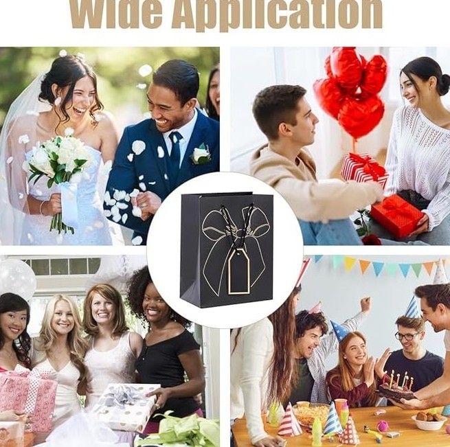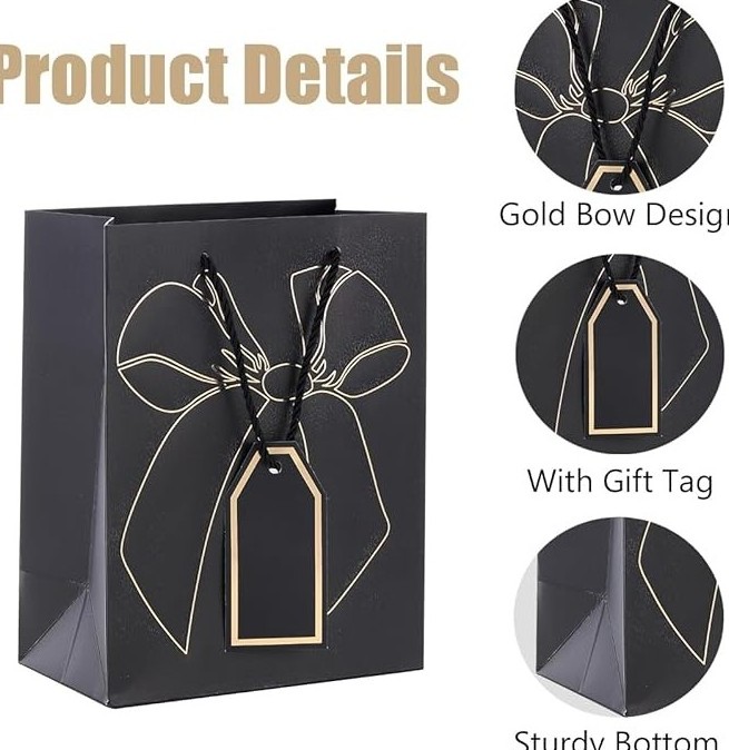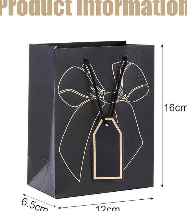 Σετ 12 πολυτελών χάρτινων τσαντών με διαστάσεις 12x16x6,5 cm, σε μαύρο χρώμα με χρυσό σχέδιο φιόγκου και ετικέτα. Ιδανικές για δώρα μικρού μεγέθους και επαγγελματική συσκευασία.