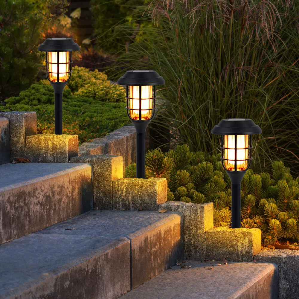 Σετ 3 ηλιακά φωτιστικά LED με πασσαλάκι, ιδανικά για εξωτερική χρήση στον κήπο ή το μπαλκόνι.