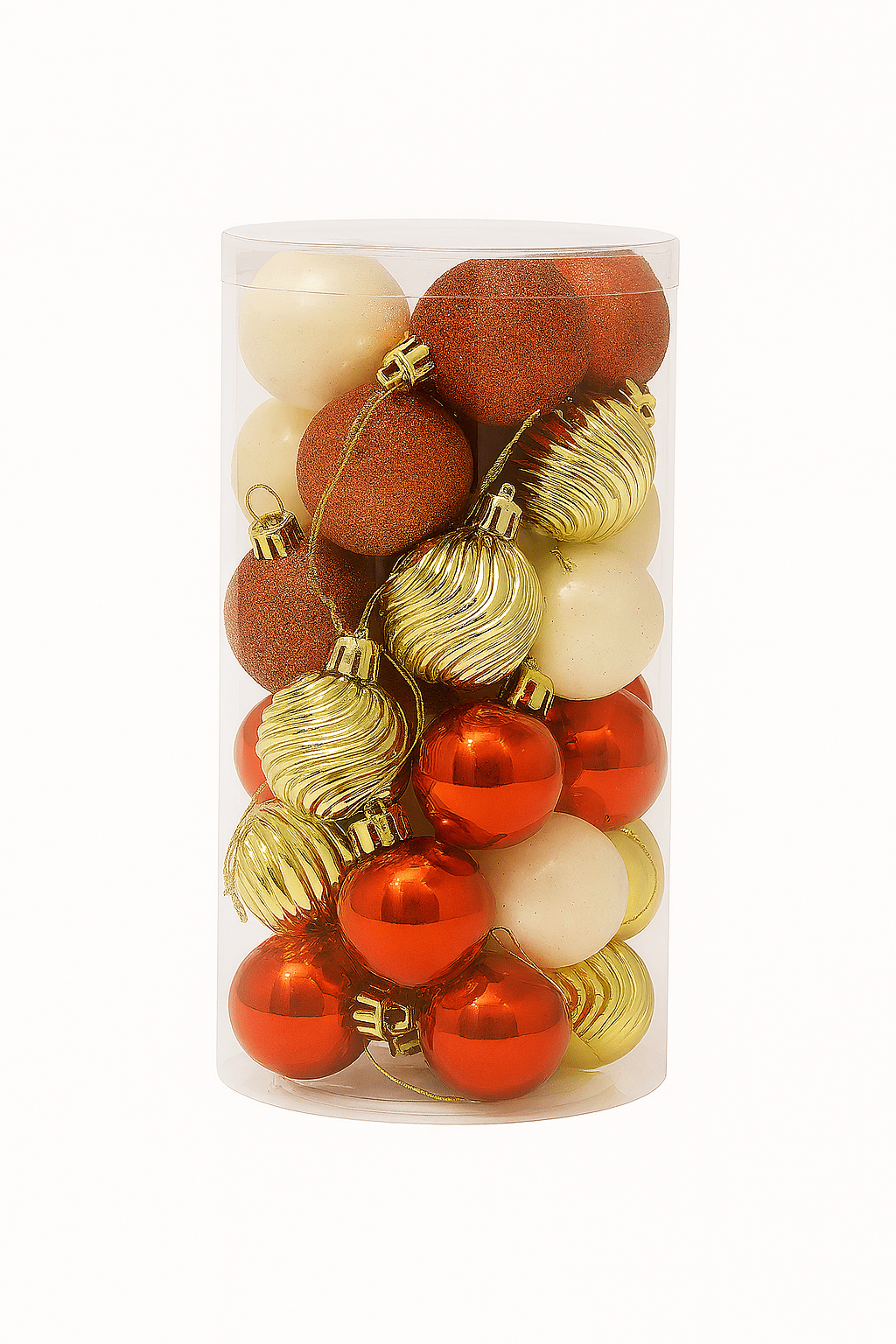 Διακοσμητικές μπάλες δέντρου σε συσκευασία των 24 τεμαχίων, με 4 διαφορετικά σχέδια: γυαλιστερές, glitter, περλέ και ριγές μεταλλικές. Διάμετρος 4 cm. Ιδανικές για εορταστική διακόσμηση με στυλ και ποικιλία.