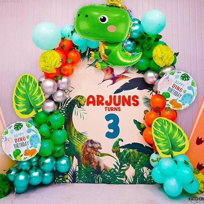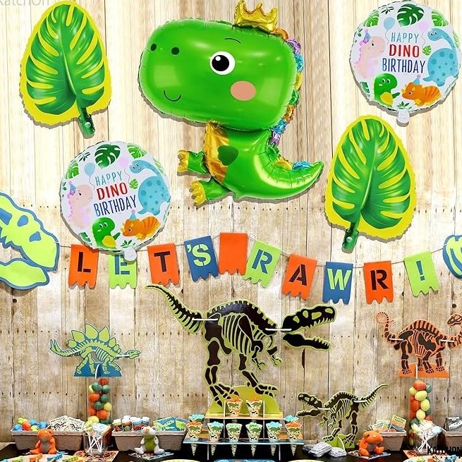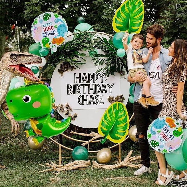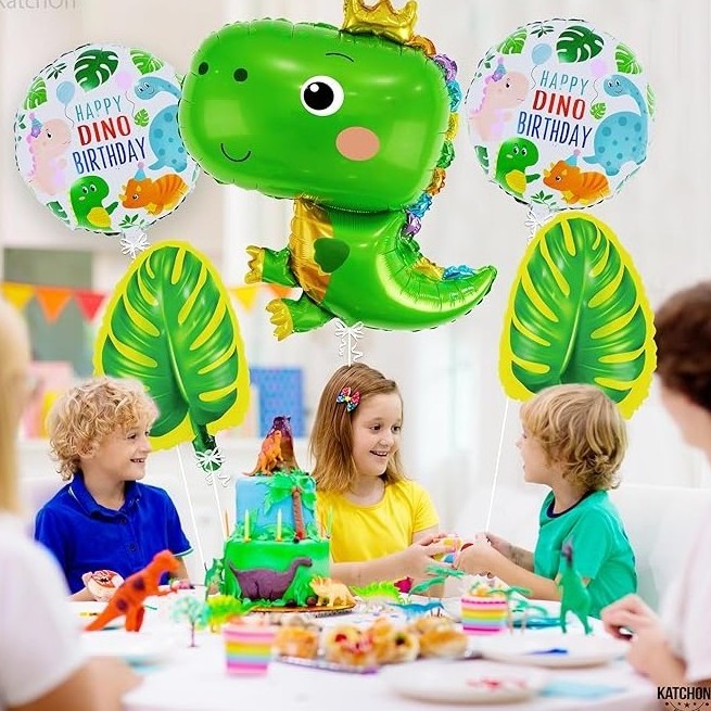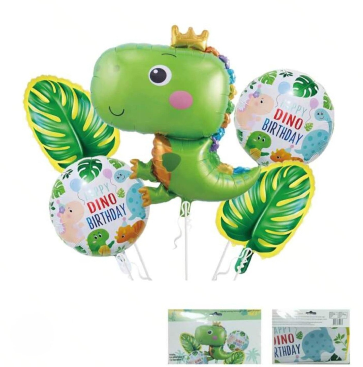 Σετ 5 μπαλονιών με σχέδιο δεινόσαυρο, φύλλα και “Happy Dino Birthday”, κατάλληλα για διακόσμηση πάρτι.