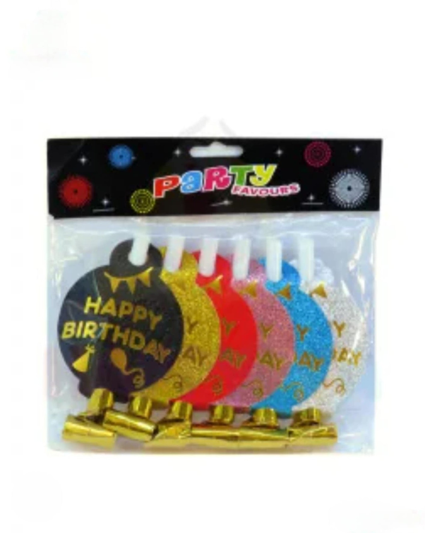 Σετ 6 σφυρίχτρες Happy Birthday με glitter διακόσμηση σε διαφορετικά χρώματα.