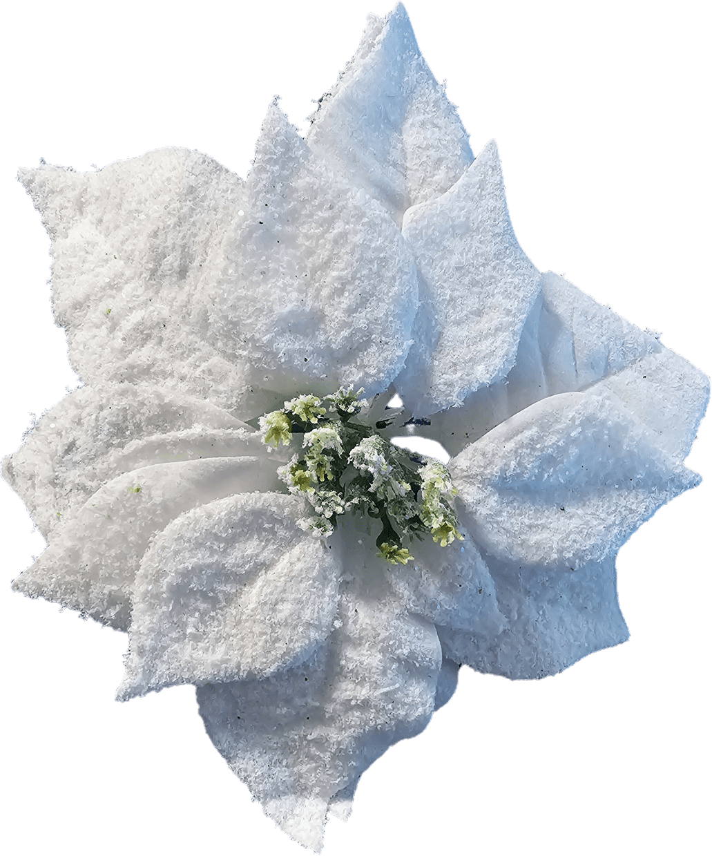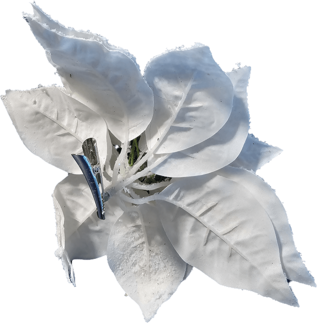 Εντυπωσιακό τεχνητό λουλούδι τύπου αλεξανδρινό (poinsettia) σε λευκή απόχρωση με παγωμένο φινίρισμα και glitter λεπτομέρειες. Ιδανικό για χριστουγεννιάτικη διακόσμηση, στεφάνια, βιτρίνες